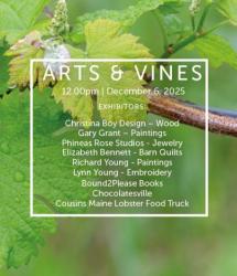 Join us for our Holiday Arts & Vines on Saturday, December 6th, from noon to 6 pm. Cousins Maine Lobster Food Truck will be here, along with artisans Christina Boy Design, Gary Grant, Phineas Rose ... MORE»