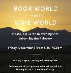 Join us for Book World Meets Wine World on Friday, December 5th. Elizabeth Becker will discuss the inspiration and themes behind her book, The Moonlight Healers. A Q&A ... MORE»