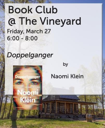 Join us at 6 pm as we discuss Doppelganger by Naomi Klein. The Vineyard opens at noon on Fridays, so drop in early for a glass of wine to enjoy during the discussion.